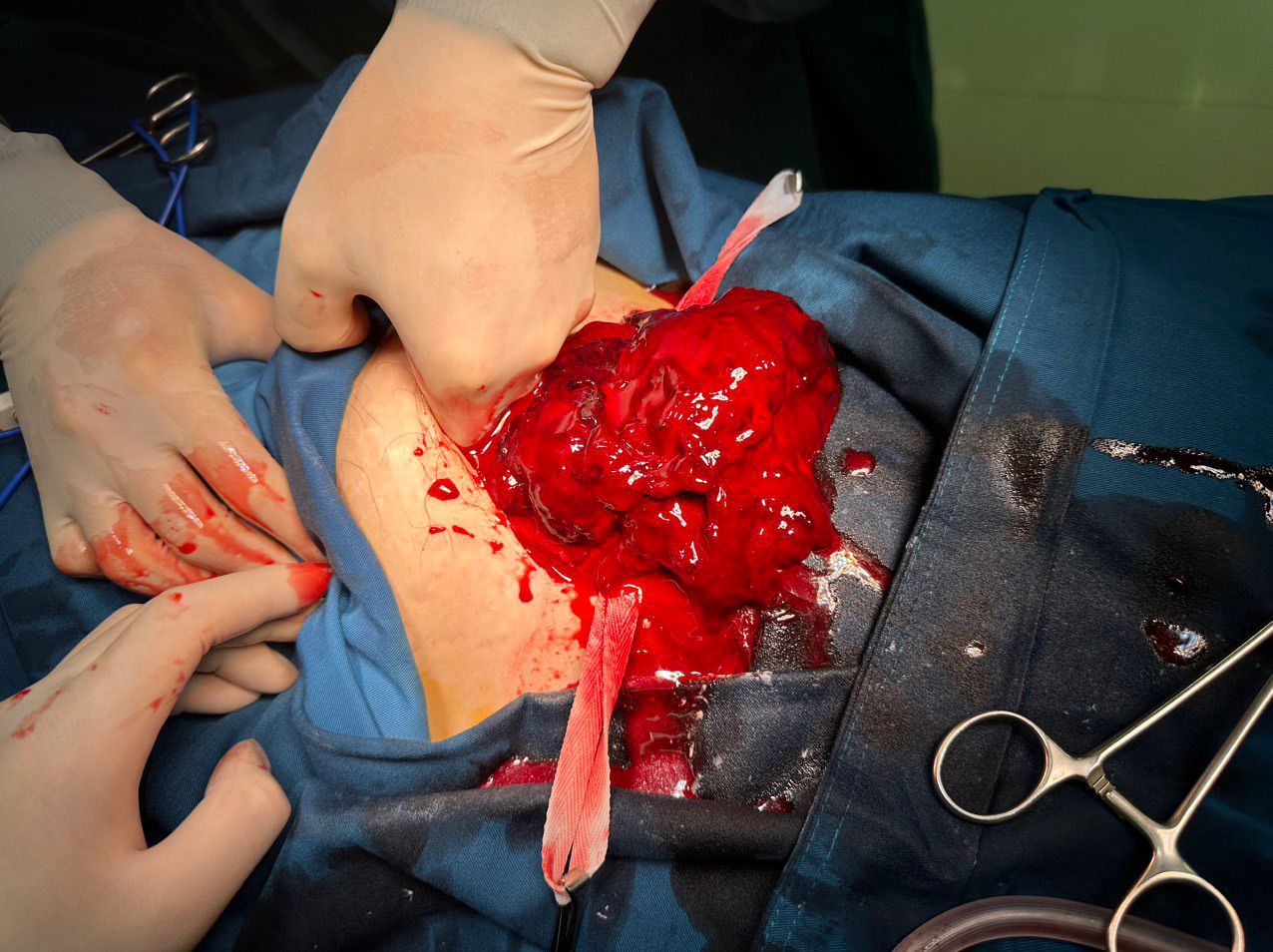 This the case of severe placental abruption and fetal death. We performed the emergency caesarean section and confirmed the massive blood clot in the uterus after remove placenta is approximately 1000 gram. Doctors successfully conserve the uterine for future pregnancy.