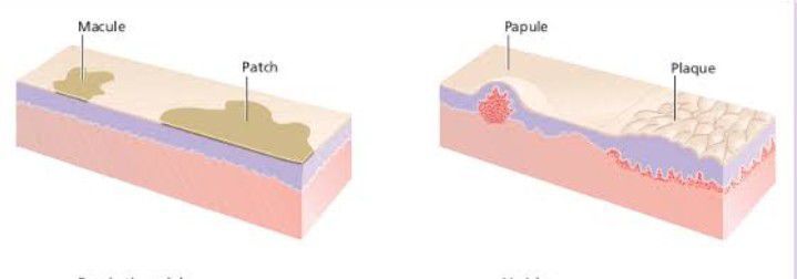 Macule — a small patch of skin that is altered in colour, but is not elevated. Patch — a large area of colour change, with a smooth surface. Papule — elevated, solid, palpable lesion that is ≤ 1 cm in diameter. They may be solitary or multiple