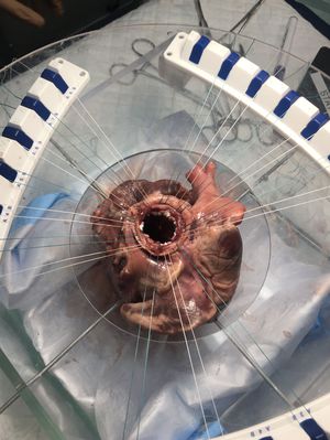 Duel ended sutures were used to stitch in a secure ‘bedding’ for the porcine valve. The coloured thread helped students keep track of where the leaflets used to reside.