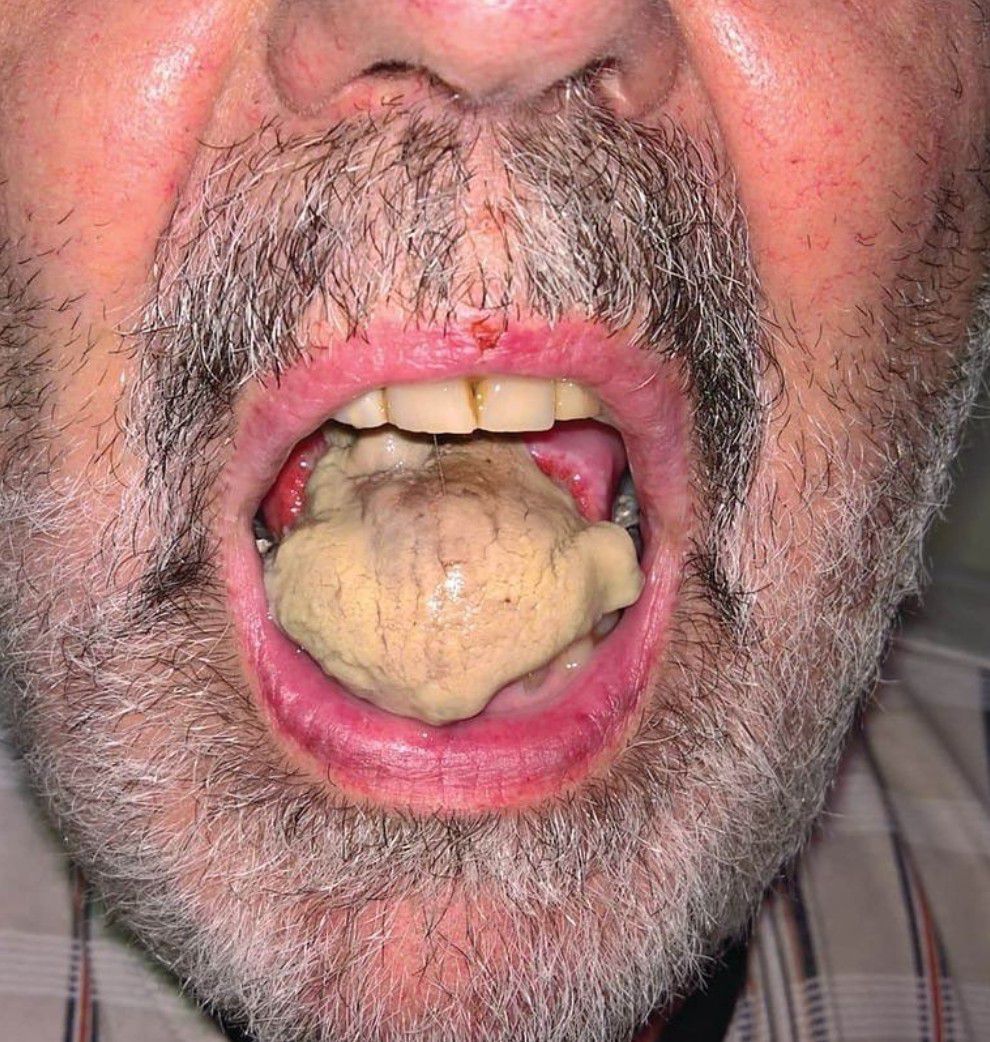 Tongue necrosis due to Giant cell arteritis (GCA). A 66-year-old patient was referred for a fever and rapidly progressive deterioration of his general state. The first symptoms appeared several days before, while the patient was visiting Thailand: fever and unusual bilateral headaches were followed by glossodynia and jaw claudication. Within about 2 h, tongue edema and jaw pain appeared. An erythematous and scabbed rash then developed on the patient’s scalp, featuring a necrosis area. The tongue evolved toward cyanosis, further to necrosis. The patient’s case history included bilateral shoulder arthralgia. C-reactive protein was 120 mg/l, and temporal artery biopsy confirmed the diagnosis of GCA. Treatment consisted of high-dose intravenous corticosteroids (methylprednisolone, 1.5 mg/kg/d for 3 d). Articular pain, headaches, and ophthalmologic symptoms drastically improved in < 48 h, while the scalp lesions responded at a slower rate. Emergency surgery for resection of the tongue necrotic tissue was performed. Because there was satisfactory primary healing, no further treatment was required. Giant cell arteritis (GCA) is a form of vasculitis involving medium- and large-sized arteries, which mainly affects the extracranial branches of the internal and external carotid arteries, particularly the temporal artery. Clinical findings are headache, jaw claudication, fever, pain, and thickening of the temporal artery. Although unusual as an initial manifestation, tongue necrosis is an important alert for diagnosing giant cell arteritis. Early diagnosis and treatment of this atypical manifestation may reduce morbidity. Credit: The Journal of Rheumatology June 2018; DOI: https://doi.org/10.3899/jrheum.171321