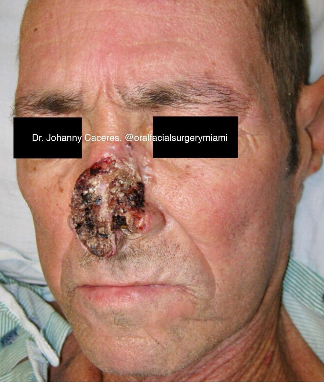 Advanced squamous cell carcinoma of the nose treated with a rhinectomy and reconstruction with a forehead flap and bilateral nasolabial flaps. Donor site covered with an skin graft.