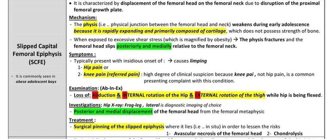 Slipped capital femoral epiphysis (SCFE) is a hip condition that occurs in teens and pre-teens who are still growing. For reasons that are not well understood, the ball at the head of the femur (thighbone) slips off the neck of the bone in a backward direction.