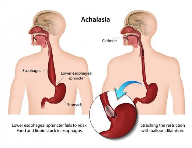 Achalasia is a rare disorder in which your esophagus is unable to move food and liquids down into your stomach. Your esophagus is the muscular tube that transports food from your mouth to your stomach. At the area where your esophagus meets your stomach is a ring of muscle called the lower esophageal sphincter (LES). This muscle relaxes (opens) to allow food to enter your stomach and contracts (tightens to close) to prevent stomach content from backing up into your esophagus. If you have achalasia, the LES doesn’t relax, which prevents food from moving into your stomach.