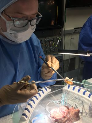 This is a practice aortic valve replacement. The heart and valve are porcine.