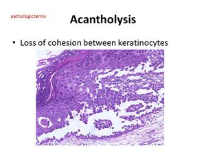 Acantholysis is the loss of intercellular connections, such as desmosomes, resulting in loss of cohesion between keratinocytes,seen in diseases such as pemphigus vulgaris