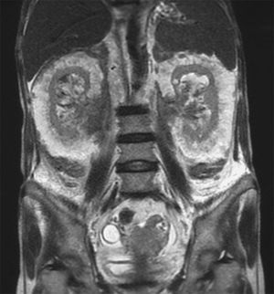 A 69-year-old woman with chronic kidney disease and myelofibrosis presented with a 2-day history of dyspnea and general weakness. Magnetic resonance imaging of the abdomen is shown here. What is the diagnosis? a) Renal-cell carcinoma b) Amyloidosis c) Angiomylipoma d) Perirenal extramedullary hematopoiesis e) Liposarcoma Source: nejm.org