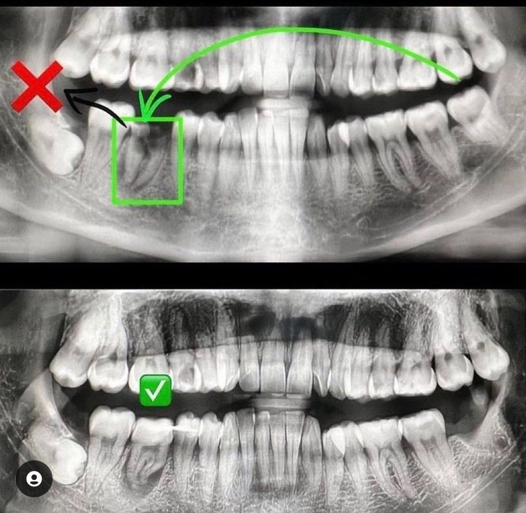 Autotransplantation is the transplantation of one's own tooth, unimportant for the bite and chewing process ("eight" or wisdom tooth), instead of a destroyed tooth that cannot be restored. In this clinical situation, tooth 46 is severely damaged. Treatment protocol: 1. Removed 46 tooth. 2. Cleaned the hole. 3. Removed tooth 38 and transplanted instead of 46 tooth. 4. Splinted on the adjacent tooth. Next stage: ✅After 2 weeks we remove the nerve and put Ca + for 2 weeks. ✅After 2 weeks we carry out obturation. We put a crown on this tooth and complete the treatment. ✳️ Another thing to consider is TIME. You will need to have time to transplant the extracted tooth within 18 minutes.