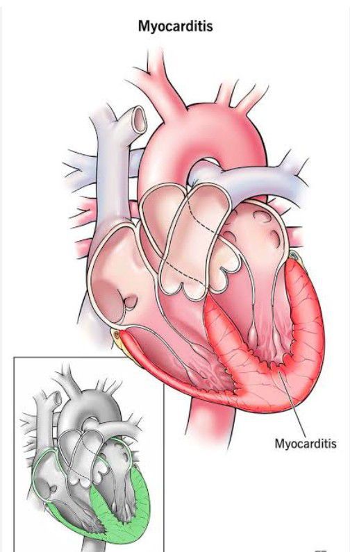 Myocarditis is inflammation of the heart muscle (myocardium). The inflammation can reduce the heart's ability to pump blood. Myocarditis can cause chest pain, shortness of breath, and rapid or irregular heart rhythms (arrhythmias). Infection with a virus is one cause of myocarditis