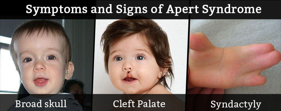 Apert syndrome is usually diagnosed at birth based on physical signs such as a high, prominent forehead, underdeveloped upper jaw, prominent eyes, and fused fingers and/or toes. Fused fingers and toes distinguish Apert syndrome from other craniofacial disorders.