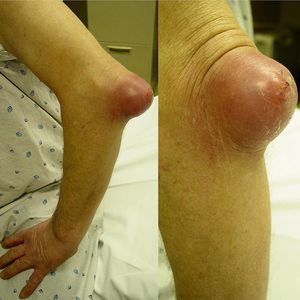 This enormous lump is an acute infectious olecranon bursitis upon presentation to emergency department!! Bursae are generally fluid-filled sac-like structures located between mobile structures of the musculoskeletal system, between skin and bone, or between the joints. In normal conditions, small amounts of synovial fluid are produced within the bursa and reduce friction by lubrication. Bursitis is the result of inflammation that leads to increased fluid production from the synovial cells that line the bursa. Increased fluid production leads to increasing pressure of the bursa and in the result, increased pain. Trauma or puncture of skin at the site of a bursa can lead to the direct introduction of bacteria and subsequent inflammation and infection. This inflammation can be caused by prolonged pressure, overuse, inflammatory and crystalloid arthritis, and direct injury or trauma. Septic (or infectious) bursitis occurs when infection from either direct inoculation (usually superficial bursa) or hematogenous or direct spread from other sites (deep bursa involvement) causes inflammatory bursitis. On physical examination, patients have tenderness at the site of the inflamed bursa. If the bursa is superficial, physical examination findings are significant for localized tenderness, warmth, edema, and erythema of the skin. The treatment for septic bursitis is always antibiotic therapy, but In chronic or severe cases, incision and drainage or bursectomy may be warranted. Image courtesy of Christopher Kabrhel, MD.