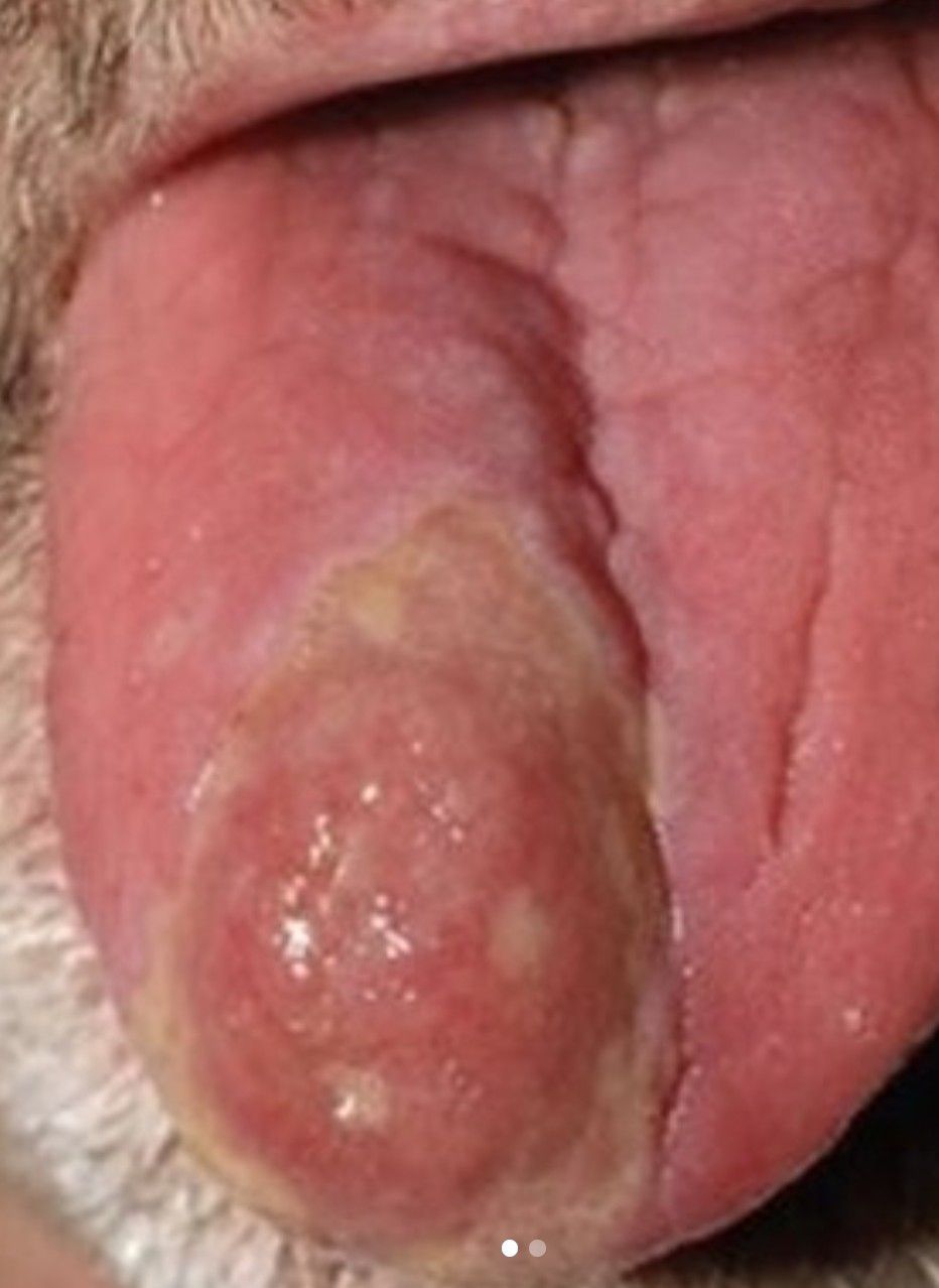 A 48-year-old man with a history of ulcerative colitis that was well-controlled with adalimumab presented with a generalized acneform eruption involving the face, chest (and back, as well as a well-defined ovoid ulcer on the anterior aspect of the tongue of 2 months’ duration. Prior treatment with prednisone 60 mg daily for 14 days resulted in no improvement. He denied unintentional weight loss, cyclic fever, or arthritis. A complete blood cell count with differential showed mild anemia (hemoglobin, 11.6 g/dL [reference range, 13.2–16.6 g/dL]) with a differential cell count that was within reference range for each cell type. The erythrocyte sedimentation rate was elevated at 44 mm/h (reference range, 0–22 mm/h). A 4-mm punch biopsy specimen of an indurated cystic papule on the torso was obtained. ✏️ What's your diagnosis? A. Behçet disease B. pustular psoriasis C. SAPHO (synovitis, acne, pustulosis, hyperostosis, osteitis) syndrome D. steroid-induced acne E. syphilis
