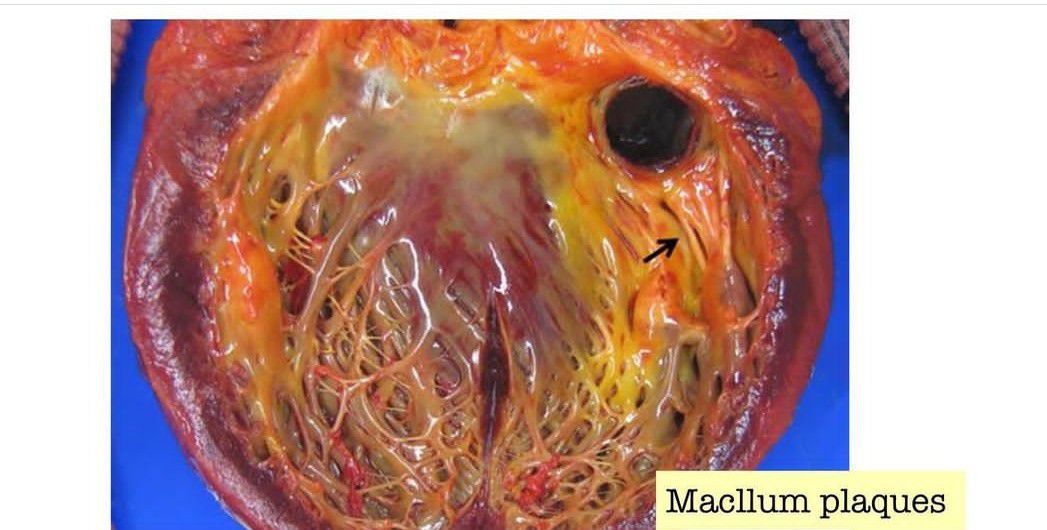 Mural endocardial lesions can be seen as MacCallum plaques in rheumatic heart disease. These plaques appear as map-like areas of thickened, roughened, and wrinkled part of the endocardium in the left atrium. Perhaps they are caused by regurgitant jets of blood flow, due to incompetence of the mitral valve. Although MacCallum plaques are one of the characteristic features in rheumatic heart disease, they are very uncommon in recent times