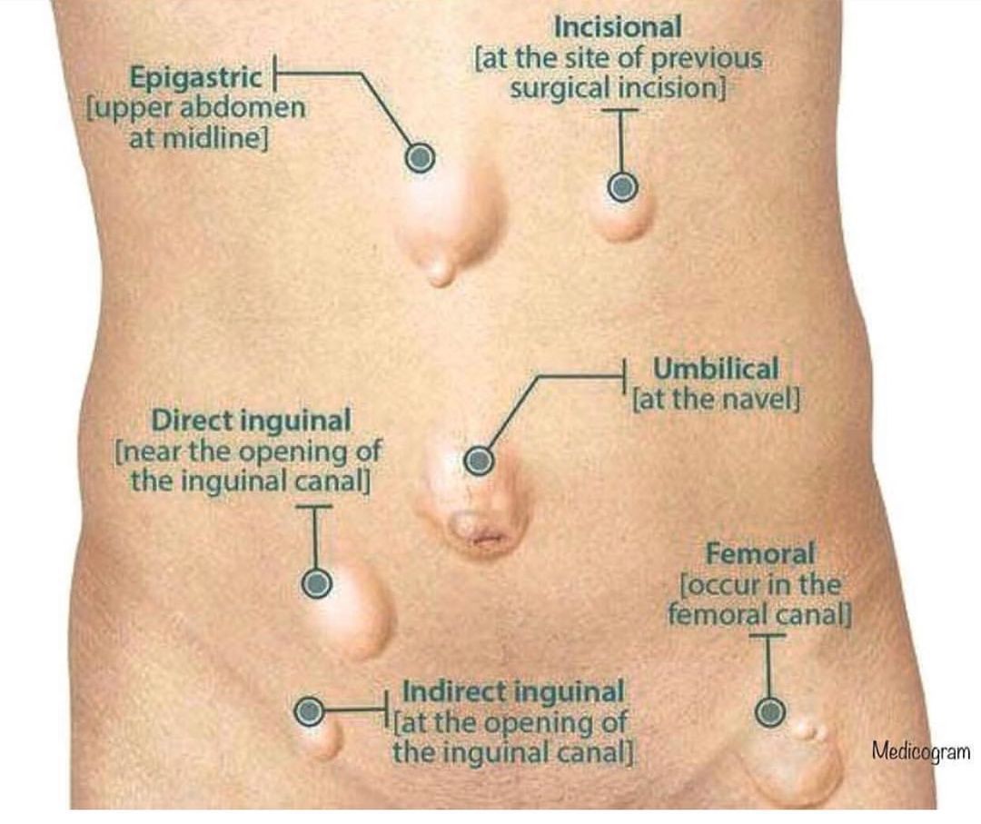 A Hernia or herniation occurs when an internal part of the body such as an organ or piece of bowel protudes through a weakness in the abdominal lining. đĽFollowing are the types of hernia: â˘Inguinal hernia: Inguinal hernia is the most common. This occurs when part of your bowel squeezes through your lower abdomen into the groin.This can be divided into Direct or Indirect Hernias depending on if the Hernia enters the inguinal canal. â˘Hiatus hernia/Diaphragmatic hernia: Hiatus hernia is when part of your stomach pushes up into the chest through an opening in the diaphragm. â˘Femoral hernia: Femoral hernia happens when fatty tissue or a part of the bowel pushes through into the groin at the top of the inner thigh. â˘Incisional hernia: Incisional hernia is when tissue pushes through a surgical wound in the abdomen that has not completely healed. â˘Umbilical hernia: Umbilical hernia is when fatty tissue or a part of the bowel pushes through the abdomen close to your belly button (navel). â˘Epigastric hernia: Epigastric hernia is when fatty tissue pushes through your abdomen, between the belly button and breast bone (sternum). @medicogram #medicine #hernia #surgery #anatomy #herniasurgery #medicogram