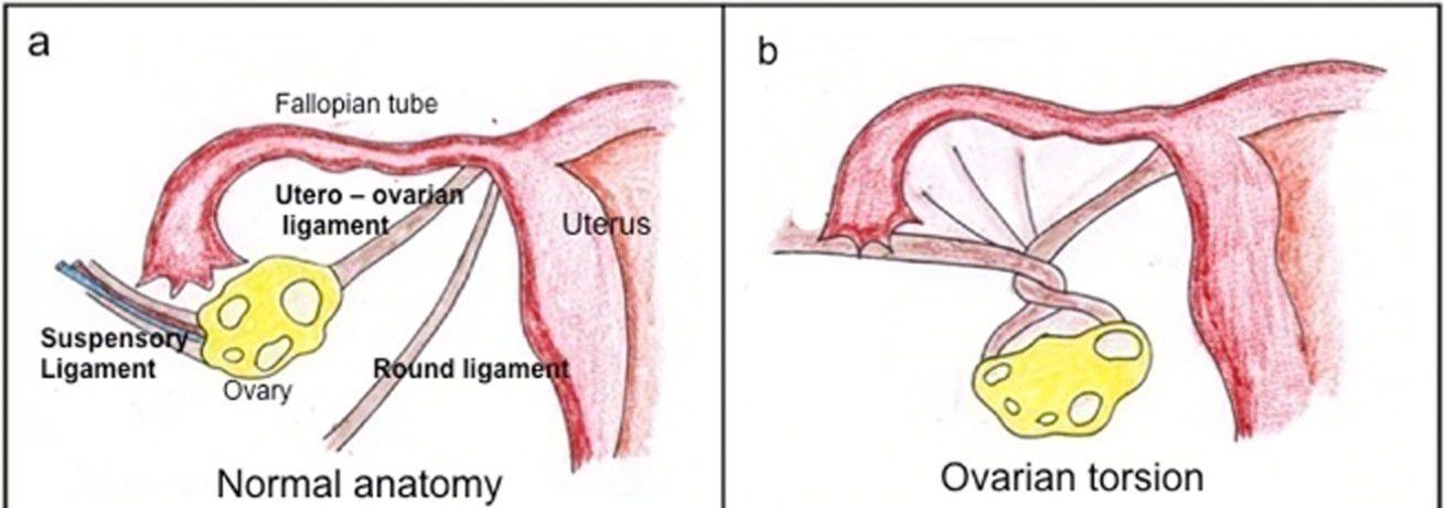 A condition occurring when the ovary or fallopian tubes twist on the tissues that support them. •Symptoms include severe pain in the pelvic area, as well as nausea and vomiting.