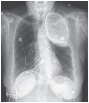 An 86-year-old woman with hypertension presents with epigastric pain and does not report any respiratory symptoms. Her chest radiograph demonstrates these findings. What is the diagnosis? Oleothorax Hemothorax Calcified empyema Non-small-cell lung cancer Asbestosis