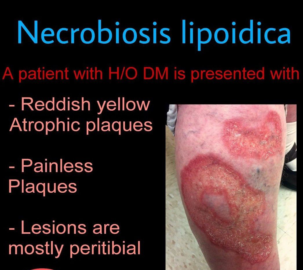 Necrobiosis lipoidica (NL) is a rare, chronic, and idiopathic granulomatous disease of collagen degeneration. It has an associated risk of ulceration and is classically associated with diabetes mellitus, usually type 1. There is a thickening of the walls of the blood vessels and deposition of fat.