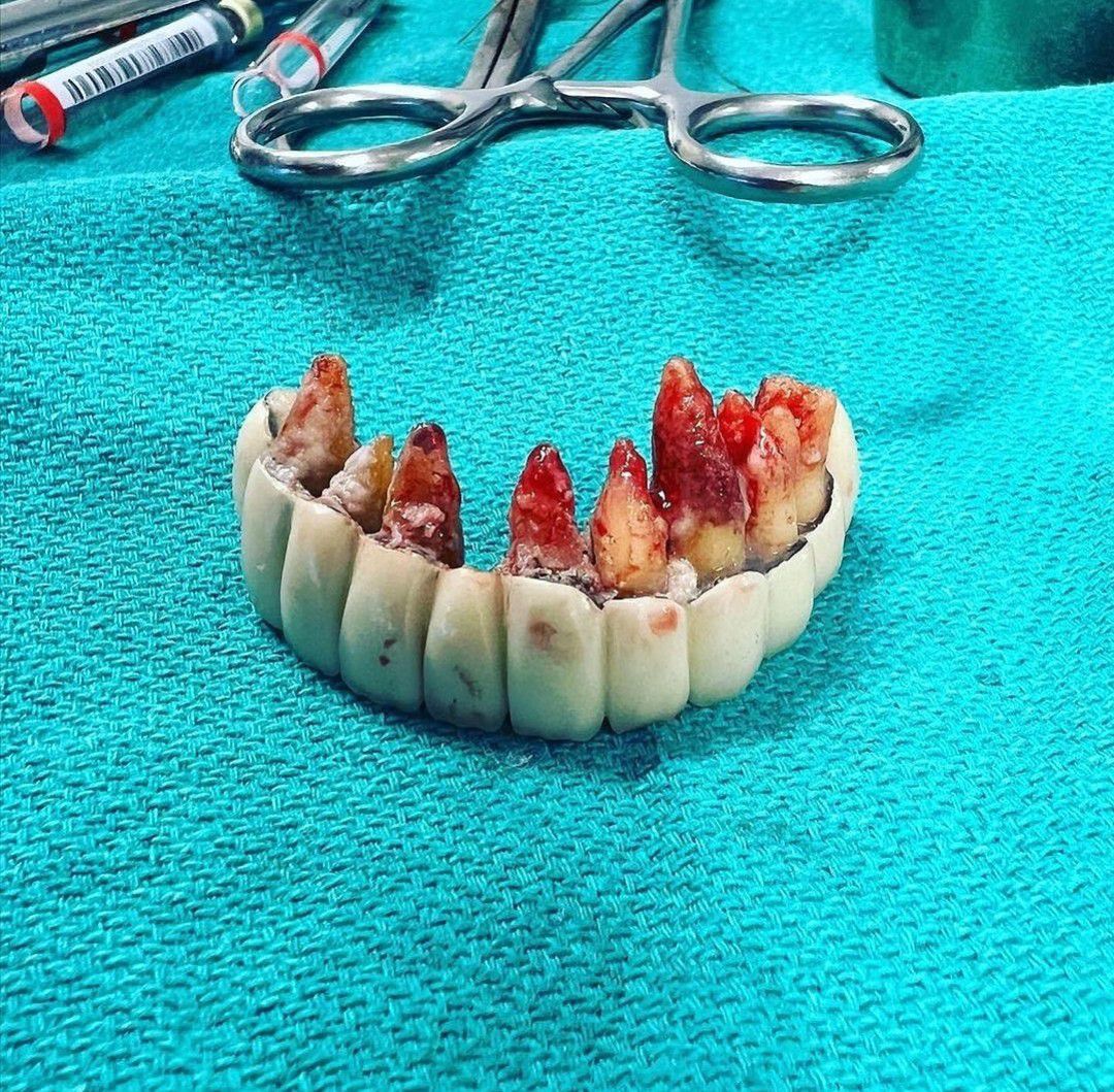 This patient came into my office last week for extraction of all of her remaining maxillary teeth due to severe periodontal disease. Once sedated, I was able to remove this bridge with one hand…no roots were retained. Just had to clean up the granulation tissue and place some sutures to help with bleeding and soft tissue healing. By: https://www.instagram.com/p/CuPYVbmN62-/?utm_source=ig_web_copy_link&igshid=MzRlODBiNWFlZA==