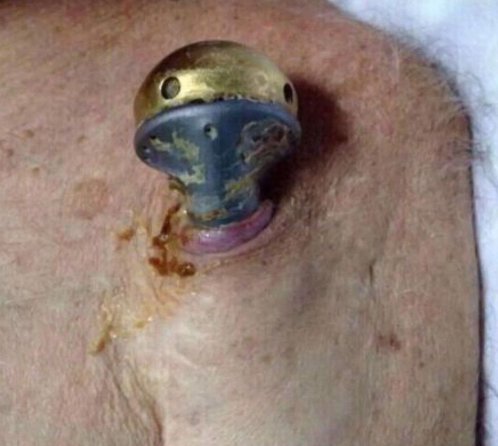 A 73-year-old patient presents with a displaced shoulder prosthesis. The shoulder prosthesis dislocated, and it slowly rose up, until it broke the skin
