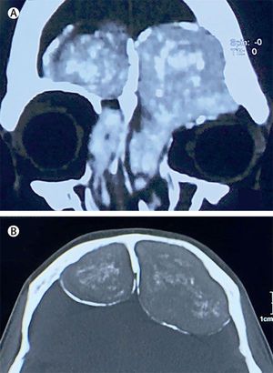 Frontal nasal lesion A 27-year-old man had a 4-month history of bilateral frontal headache, irritability, frontal lobe signs, bilateral proptosis, and nasal obstruction. Craniotomy revealed intracranial extension of a grey-coloured, foul smelling, soft tissue mass extending from the nasal sinuses. 1) Allergic rhinocerebral aspergillosis 2) Angiofibroma 3) Nasopharyngeal carcinoma with skull base extension 4) Fibrous dysplasia