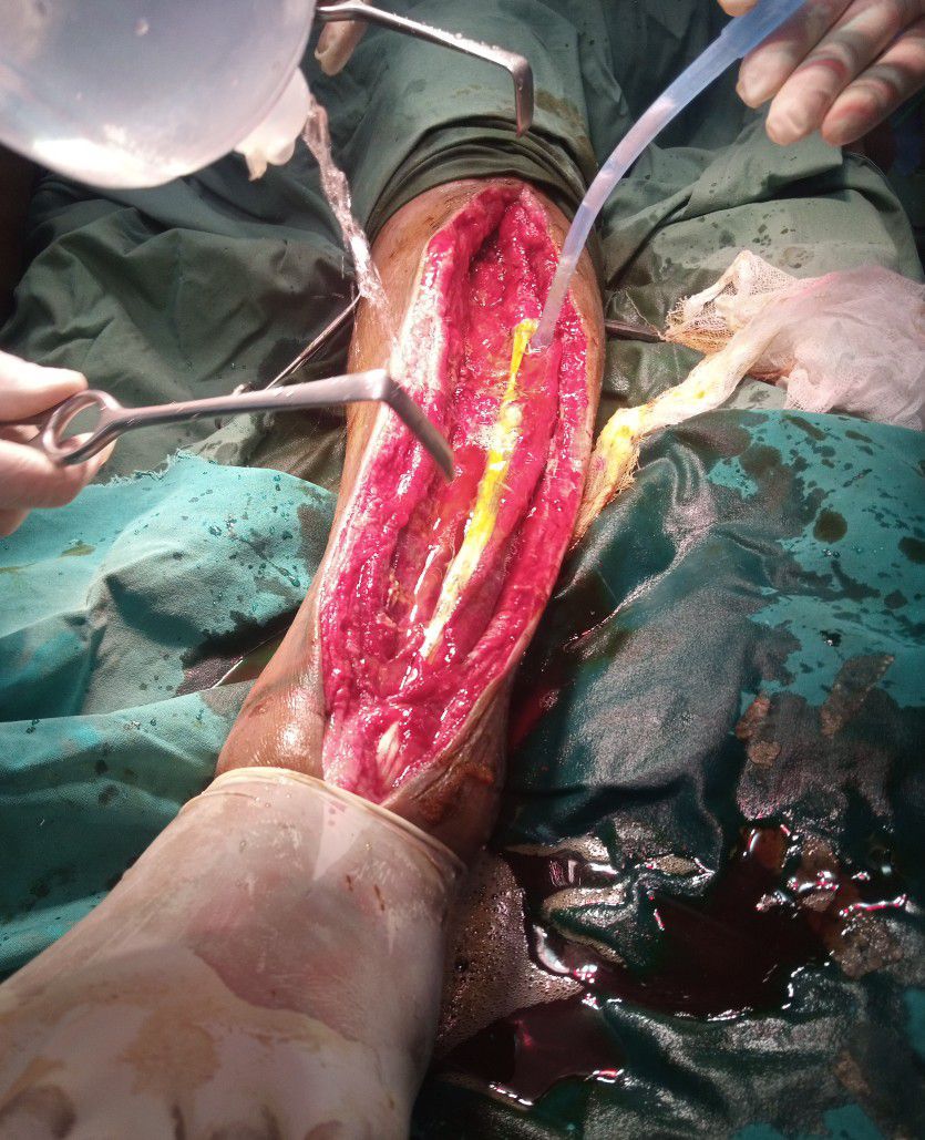 Pus C/S revealed Klebsiella pneumoniae . patient received sequential debridmemts VAC dressings local(Amikacin)+IV(meropenem)antibiotics for 20 days . implant was removed ,then infection settled