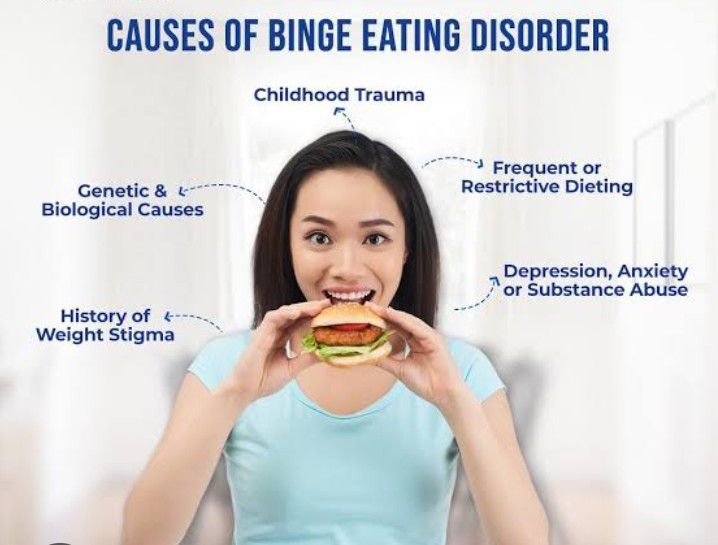Some psychological reasons for binge eating are because an individual feels empty/a lack of emotion, is responding to a trauma, or is under a high level of stress.