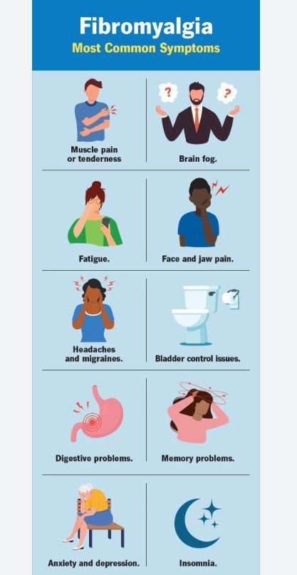 What are the signs and symptoms of fibromyalgia? Pain and stiffness all over the body. Fatigue and tiredness. Depression and anxiety. Sleep problems. Problems with thinking, memory, and concentration. Headaches, including migraines.