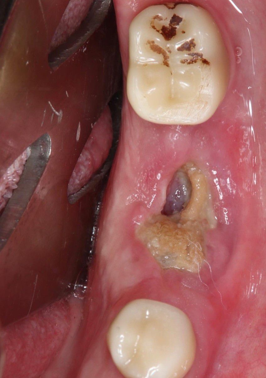 An Update on Management of Medication-Related Osteonecrosis of the Jaw (MRONJ). The AAOMS revised their position paper on MRONJ last year (2022), which is updated from 2014. A few key points: - New meds as risk factors for MRONJ: Tyrosine kinase inhibitors (TKIs such as sunitinib, monoclonal antibodies (bevacizumab), fusion proteins (aflibercept), mTOR inhibitors (everolimus), radiopharmaceuticals (radium 223), selective estrogen receptor modulators (raloxifene) and immunosuppressants (methotrexate and corticosteroids) - Duration of medication therapy DOES NOT significantly increase the risk of MRONJ - Bone turnover markers are NOT validated (ie CTX) for clinical decision making in regards to MRONJ risk - Dental implants should be avoided in cancer patients receiving IV antiresorptive or antiangiogenic medications (not new, necessary reminder) My patient has a history of lung cancer and treated with IV zometa. A few months prior to seeing me, had tooth 19 and implant 20 removed. She subsequently developed stage 2 MRONJ. We started her on pentoxifylline/Vit E for 2 weeks and amoxicillin prior to surgical debridement. We continued PENTE for two weeks post op and augmentin. She is healing beautifully 1 month out with no pain.