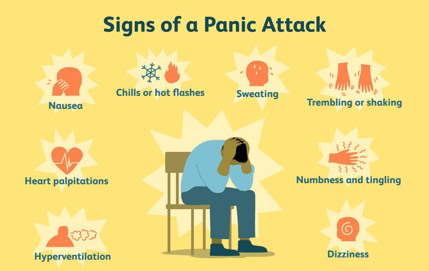 Symptoms include: a racing heartbeat. feeling faint. sweating. nausea. chest pain. shortness of breath. trembling. hot flushes.