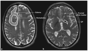 Download scientific diagram| Representative pictures of hematoma and perihematoma edema measurements. a ROIs drawn around the perimeters of the perihematoma edema and hematoma. b ROIs drawn...
