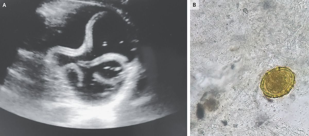A 20-year-old man presented to the emergency department with a 1-day history of abdominal pain, diarrhea, and vomiting. He had previously been healthy, with no relevant medical history. The heart rate was 96 beats per minute, and the blood pressure was 96/60 mm Hg. On examination, the abdomen was soft and nontender. Laboratory studies showed a hemoglobin level of 19.5 g per deciliter (reference range, 12 to 15), a white-cell count of 20,800 per cubic millimeter (reference range, 4000 to 11,000) with 72.7% neutrophils, and an eosinophil count of 25 per cubic millimeter (reference range, 20 to 500). A point-of-care ultrasound examination of the inferior vena cava was performed to assess the patient’s intravascular fluid status. During the examination, a tubular echogenic structure that moved with a curling motion was seen inside the lumen of the stomach (Panel A and video). Examination of stool for ova and parasites revealed fertilized eggs from roundworms of the species Ascaris lumbricoides (Panel B), and a diagnosis of ascariasis was made. In addition to receiving intravenous fluids, the patient was given a single 400-mg dose of oral albendazole, and he was discharged after 1 day in the hospital. At follow-up in the outpatient clinic 2 weeks after discharge, he reported feeling well and noted that he had passed worms in his stool.