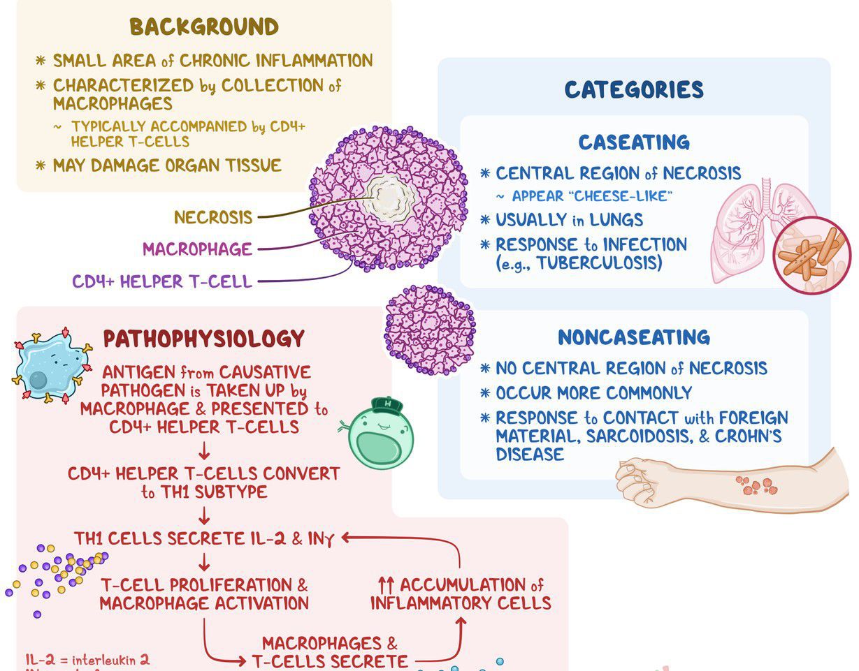 What causes granulomas? Granulomas form when immune cells clump together and create tiny nodules at the site of the infection or inflammation. A granuloma is the body's way of: containing a bacterial, viral or fungal infection, to keep it from spreading (also called a caseating granuloma);