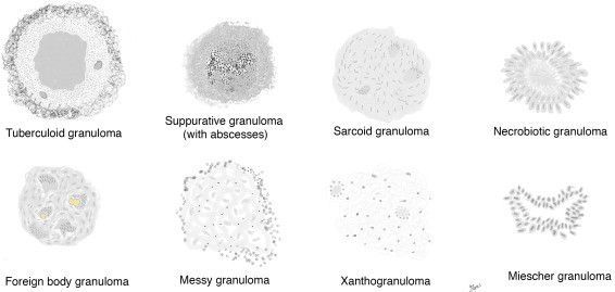 Six types of granulomatous skin lesions are identified according to cellular constituents and associated changes: 1) tuberculoid, 2) sarcoidal, 3) necrobiotic, 4) suppurative 5) foreign body and 6) histoid type granuloma