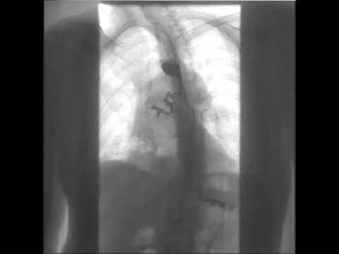A 50-year-old man presented to the emergency department with a 5-day history of shortness of breath, chest pain, and a cough. Fifteen days before presentation, he had received a diagnosis of large-cell neuroendocrine carcinoma of the lung with brain metastases. The oxygen saturation was 93% while the patient was breathing ambient air. The physical examination was notable for diminished breath sounds in the right lower lobe, as well as paroxysms of cough after fluid intake. Computed tomography of the chest showed diffuse bilateral interstitial infiltrates, as well as the known lung lesion surrounding the middle third of the esophagus. Testing for severe acute respiratory syndrome coronavirus 2 (SARS-CoV-2) was negative. Water-soluble contrast esophagography revealed material passing from the esophagus to the right bronchial tree and ascending to the right main bronchus and trachea as the patient coughed (see video). A diagnosis of bronchoesophageal fistula due to lung carcinoma was made. A covered, self-expanding metal stent was placed in the esophagus, which alleviated the patient’s cough and chest pain. Treatment with chemotherapy was initiated; however, the patient transitioned to hospice care and died 4 weeks after presentation.