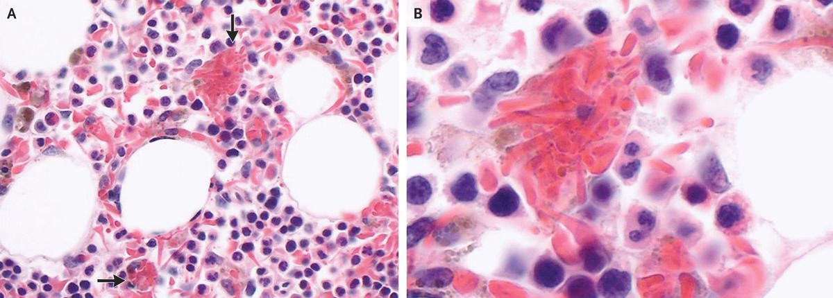 A 60-year-old man presented to the hematology clinic with fatigue and dyspnea on exertion. He had a history of sickle cell disease with hemoglobin genotype SS. Physical examination was notable for conjunctival pallor and mild scleral icterus. Laboratory studies showed a hemoglobin level of 5.9 g per deciliter (baseline range, 6 to 8; reference range, 13.5 to 16) with undetectable hemoglobin S. The ferritin level was elevated at 11,505 ng per milliliter (reference range, 22 to 277). The patient was admitted to the hospital, and evaluation for infectious causes of anemia, including testing for cytomegalovirus, Epstein–Barr virus, and parvovirus, was negative. Bone marrow biopsy revealed normocellular bone marrow with marked erythroid hyperplasia and hemosiderosis. Numerous hemophagocytic histiocytes containing sickle cells were seen on light microscopy (Panel A, arrows; Panel B shows a magnified view). The criteria for the diagnosis of hemophagocytic lymphohistiocytosis were not met. Hemophagocytosis in sickle cell disease is a rare but recognized entity that is associated with viral infections. Selective hemophagocytosis of sickle cells with peripheral disappearance of hemoglobin S as a cause of severe anemia is highly unusual. The patient received treatment with red-cell transfusions and iron chelation. He was discharged from the hospital and continues to receive maintenance red-cell transfusions every 3 weeks.