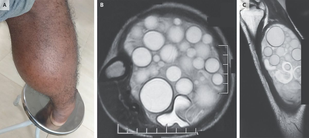 A 35-year-old man presented to the outpatient clinic with a 6-month history of progressive swelling of his right lower leg. The physical examination was notable for firm swelling in the right lower leg without any warmth or tenderness on palpation (Panel A). Magnetic resonance imaging of the right lower leg revealed a well-defined cystic lesion, measuring approximately 19.2 cm by 12.4 cm by 9.8 cm, with multiple daughter cysts and floating membranes (Panels B and C). Computed tomography of the thorax and abdomen showed no cysts. The appearance was consistent with echinococcal cysts, and an enzyme-linked immunosorbent assay for the detection of antibodies to echinococcus was positive. Cystic echinococcosis, also called hydatid disease, is caused by the echinococcus tapeworm. The patient was treated with albendazole for 7 days before undergoing pericystectomy. Infection with Echinococcus granulosus was confirmed. The patient had an uneventful postoperative course and received albendazole for an additional 3 weeks after surgery. At a follow-up visit after the completion of treatment, he had no signs or symptoms of recurrence.
