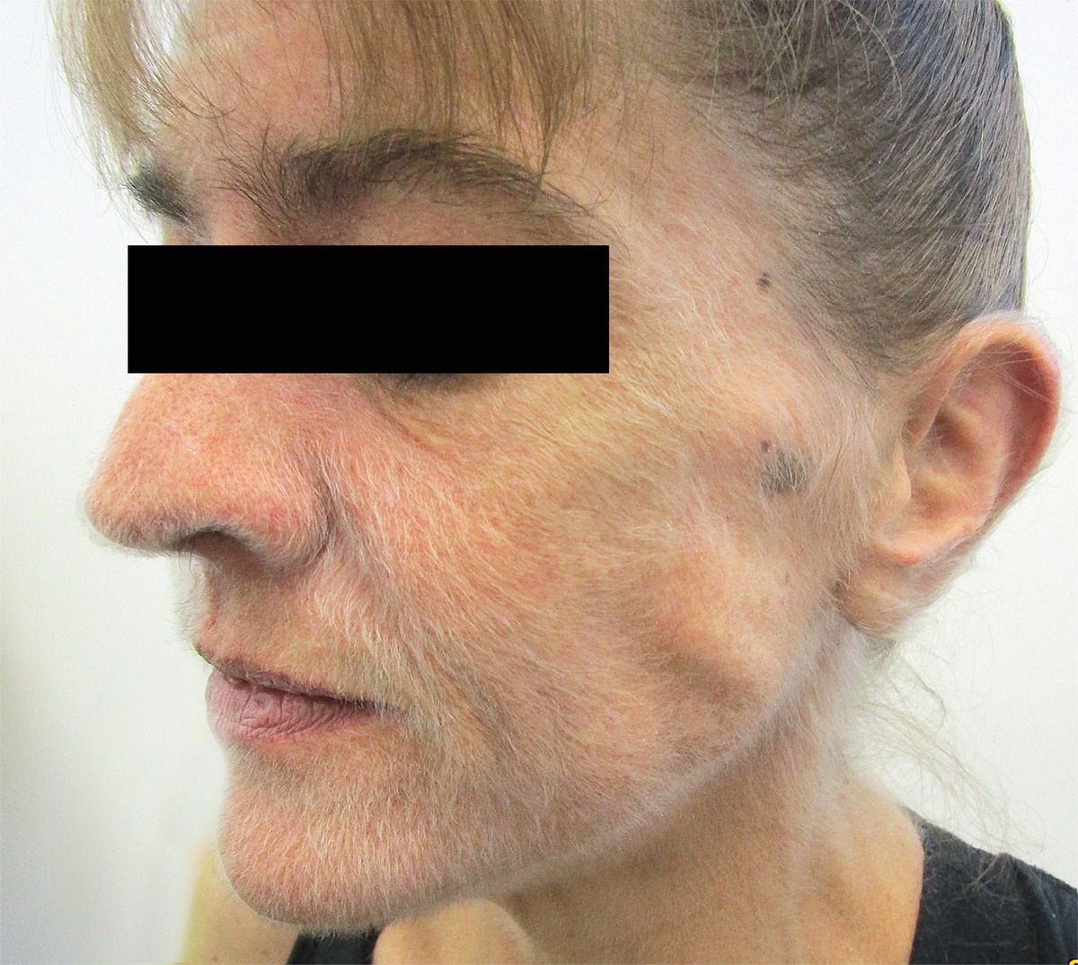 A 51-year-old woman presented to the dermatology clinic with a 2-month history of rapidly progressing hair growth on her face, neck, and upper body in association with fatigue, weight loss, and cough. She had a 37-pack-year history of smoking but had no other relevant medical history and was taking no medications. On examination, lanugo-type hair was observed on the face, ears, neck, and upper trunk. This finding, referred to as acquired hypertrichosis lanuginosa, may be associated with underlying cancer, endocrine disorders, anorexia nervosa, or certain medications. Positron-emission tomography–computed tomography revealed avid nodal disease in the right supraclavicular fossa and a 12-mm opacity in the lower lobe of the right lung. Biopsy of the right supraclavicular lymph node was performed, and a diagnosis of primary lung adenocarcinoma was made. The patient received treatment with chemotherapy and radiation followed by durvalumab. Two months after the start of treatment, the hair growth had slowed substantially, and the cough and weight loss had completely resolved.