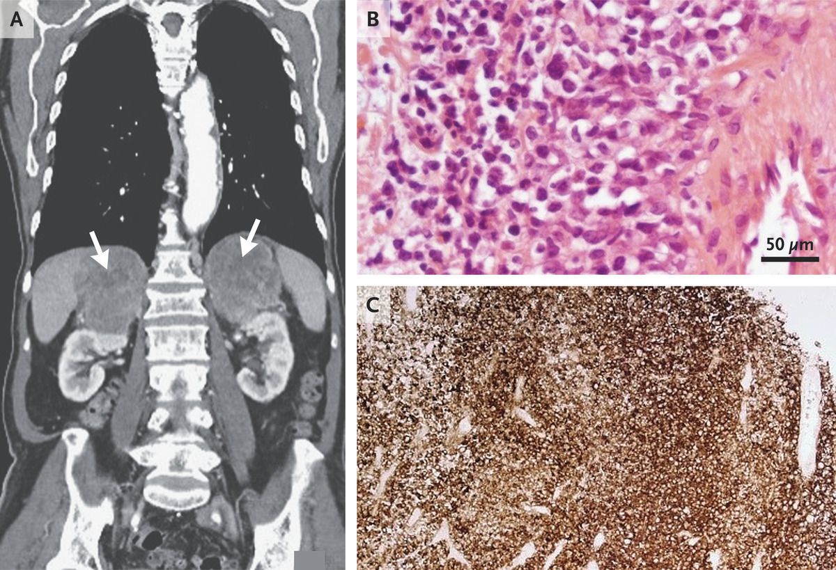 An 83-year-old man with coronary artery disease, hypertension, and hyperlipidemia presented to the emergency department with a 6-week history of fatigue, loss of appetite, and weight loss. His blood pressure was 115/80 mm Hg while he was seated but dropped to 95/65 mm Hg after he stood up. Laboratory studies were notable for a sodium level of 130 mmol per liter (reference range, 133 to 146) and a potassium level of 5.6 mmol per liter (reference range, 3.5 to 5.3). Cosyntropin stimulation testing showed an inadequate peak cortisol level; the corticotropin level was elevated at 87 ng per liter (reference range, 7 to 63). After the patient began treatment with hydrocortisone and fludrocortisone, his energy and appetite improved, and his electrolyte levels normalized. Computed tomography of the abdomen revealed marked enlargement of both adrenal glands, each of which measured more than 9 cm in greatest dimension, without lymphadenopathy (Panel A, arrows). After confirmation of normal plasma metanephrine levels, an adrenal biopsy was performed, which revealed high-grade B-cell lymphoma. Hematoxylin and eosin staining showed nuclear pleomorphism (Panel B), and immunohistochemical staining for the B-cell marker CD20 was positive (Panel C). Primary adrenal lymphoma is rare. It typically occurs in both adrenal glands and may be associated with adrenal insufficiency, as in this case. Chemotherapy was initiated, and the patient was doing well after 3 months.