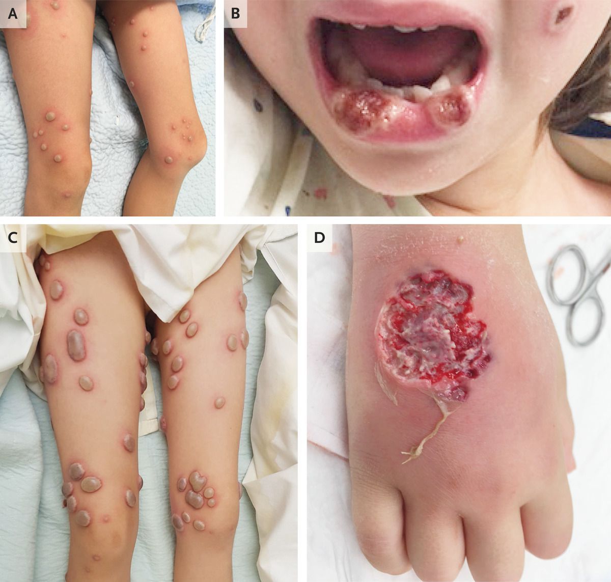 A 7-year-old girl presented to the emergency department with a 2-week history of fever and with several days of painful blisters on her arms, legs, and face. Two weeks earlier, she had completed a course of penicillin for tonsillitis. On examination, there were multiple bullae with erythematous bases on the legs (Panel A) and well-demarcated, painful lesions on the lip and soft palate with a shallow round ulcer on her left cheek (Panel B). Laboratory studies showed a white-cell count of 32,000 per cubic millimeter (reference range, 5000 to 14,500), with 88% neutrophils. Despite treatment with antibiotic agents and acyclovir, the lesions progressed (Panel C). Tests for infectious causes, including blood cultures, serologic testing for Epstein–Barr virus and Mycoplasma pneumoniae, wound testing for herpes simplex virus and varicella zoster virus, and bacterial culture, were negative. On hospital day 5, a new skin ulcer developed on the right hand at an intravenous cannula site (Panel D). Pathergy, the development of new lesions induced by minor trauma, may be seen in patients with neutrophilic dermatoses such as postinfectious Sweet’s syndrome and bullous pyoderma gangrenosum. A biopsy sample of the ulcer showed a dense neutrophilic infiltrate extending to the base of the lesion, a finding consistent with a neutrophilic dermatosis. The lesions abated with methylprednisolone and oral cyclosporine therapy and wound care. At follow-up 12 months later, most of the lesions had almost completely resolved, with no evidence of ongoing inflammation.