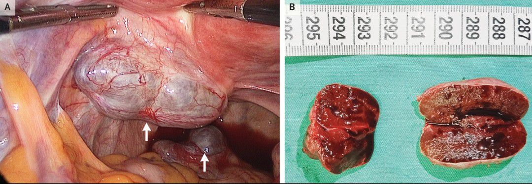 A 34-year-old woman presented to the hospital with a 2-year history of intermittent pelvic pain. Her surgical history included a cesarean section performed 10 years earlier and a partial splenectomy performed 29 years earlier after an automobile accident. The pelvic examination was notable for a soft parauterine mass that was mildly tender on palpation. Magnetic resonance imaging of the pelvis showed solid nodules with high T2-weighted signal intensity and restricted diffusion. An exploratory laparoscopy was performed and showed a hypervascular lesion (measuring 5 cm by 3 cm by 2.5 cm) on the left mesometrium and a second lesion (measuring 2.5 cm by 2 cm by 1.5 cm) on the mesorectum (Panel A, arrows), as well as a normal-appearing residual spleen in the left upper quadrant of the abdomen. Both masses were resected and appeared to be solid, encapsulated, and congested with blood (Panel B). Examination of a frozen section revealed splenic tissue. Splenosis is an uncommon condition in which splenic tissue autotransplants, typically after trauma or splenectomy. Pelvic splenosis can mimic gynecologic neoplasms. The patient’s pelvic pain resolved after the surgery.