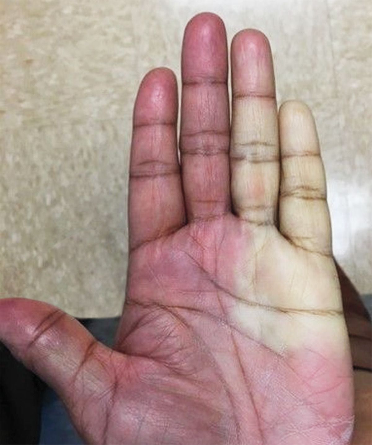 A 43-year-old woman presented to the neuromuscular clinic with a 6-month history of mild weakness and progressive paresthesia in the thumb and index, middle, and ring fingers of the left hand. For treatment of carpal tunnel syndrome, she received an injection of 0.33 ml of glucocorticoid into the left carpal tunnel and quickly reported feeling what she described as an “odd sensation.” Within 5 minutes after the injection, the skin overlying the affected thumb and fingers and adjacent palm extending to the palmar ulnar surface became red. The vasomotor disturbance was presumably related to the irritation of autonomic fibers in the median nerve. Within 20 minutes, these changes resolved without intervention. On follow-up 1 month after the injection, the paresthesia had resolved.