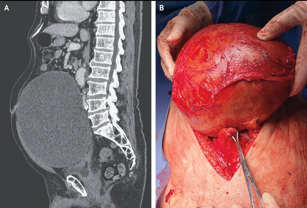 An 80-year-old man presented to the emergency department with abdominal bloating and constipation. He had no lower urinary tract symptoms or gross hematuria but had lost 5 kg during the previous 8 months. The physical examination was notable for a distended abdomen with a mass that extended from the epigastrium to the pelvis and was nontender and dull on percussion. A distended bladder was suspected, and a urinary catheter was inserted. However, only a small amount of urine was drained, and the abdominal mass persisted. Computed tomography of the abdomen and pelvis, which was performed after the administration of intravenous contrast material, showed a large cystic mass (Panel A). During a surgical procedure, the mass, which measured 30 cm at its largest dimension, was found to involve the dome of the bladder but was separate from the bowels and mesentery (Panel B). Histologic analysis of the resected mass showed a urachal mucinous cystic tumor of low malignant potential, with no evidence of invasive carcinoma. Although some urachal tumors can have metastatic potential, this specific type is usually benign. The patient recovered well postoperatively, and at a follow-up visit 3 months later, he remained well with no further abdominal symptoms.