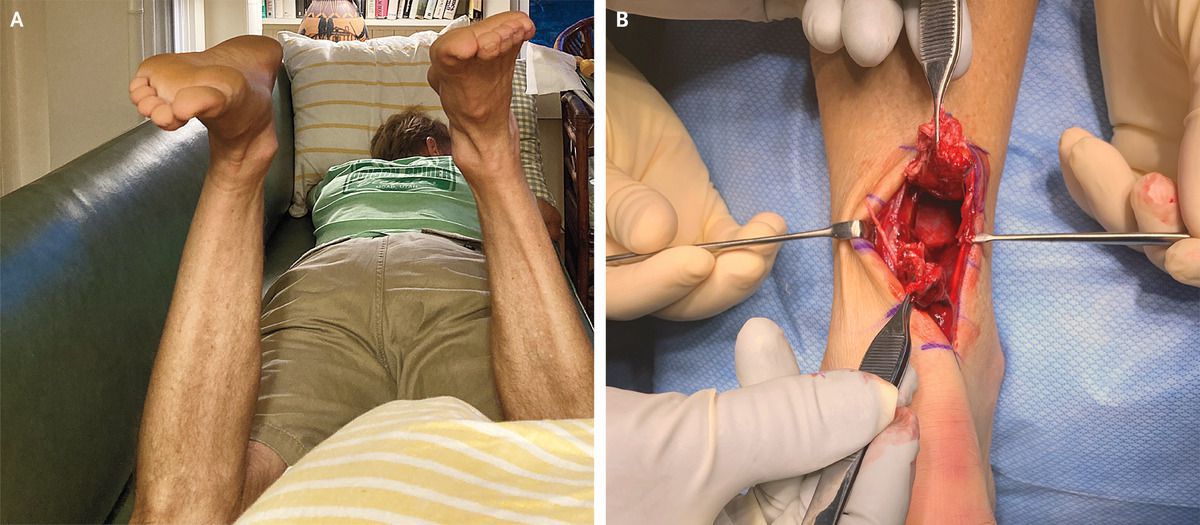 A 54-year-old man presented for a remote orthopedic evaluation with pain in his left lower leg. The pain had started the previous day while he was playing tennis; he had lunged to the right off of his left foot and then felt a tearing sensation in his lower left leg. He had been unable to bear weight on that leg since the time of the injury. On examination during the video consultation, the Matles test was performed. The patient was asked to lie in the prone position, flex his knees to a 90 degree angle, and relax; asymmetry of the feet with abnormal dorsiflexion of the left foot was apparent (Panel A). This finding is suggestive of a rupture of the Achilles’ tendon. Other physical-examination maneuvers to assess for Achilles’ tendon rupture, such as having the examiner squeeze the calf to assess plantarflexion, could not be performed remotely. Surgical intervention was planned, and the diagnosis of an Achilles’ tendon rupture was confirmed intraoperatively (Panel B). Tendon repair was performed, after which the patient gradually increased weight-bearing while wearing a medical boot for 6 weeks and participated in physical therapy for 3 months. At follow-up 5 months after surgery, the patient had a normal gait and improving strength and was advised to begin light jogging.