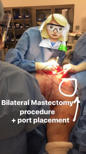 Bilateral mastectomy of a breast attacked by cancer, the patient is having chemiotherapy and a port placement has been put in the breast to make easy the access to sublaiv vein for giving her drugs she needs