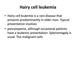 Hairy cell leukemia is a type of cancer in which the bone marrow makes too many lymphocytes (a type of white blood cell). Hairy cell leukemia is a cancer of the blood and bone marrow. This rare type of leukemia gets worse slowly or does not get worse at all