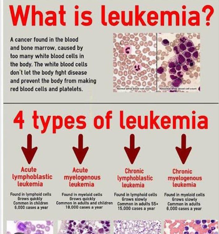 Types of leukemia From sources across the web Acute lymphocytic leukemia Chronic lymphocytic leukemia Chronic myeloid leukemia Acute myeloid leukemia Hairy cell leukemia Acute promyelocytic leukemia T-cell prolymphocytic leukemia Lymphoid leukemia Large granular lymphocytic leukemia B-cell prolymphocytic leukemia