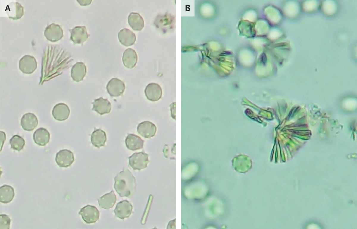 Fatigue and decreased urinary output developed in a 42-year-old man who had been admitted to the hospital for treatment of Pneumocystis jirovecii pneumonia. He had a history of infection with the human immunodeficiency virus (HIV). The CD4+ T-cell count was 122 per cubic millimeter, and the HIV viral load was 1,430,000 copies per milliliter. The fatigue and decreased urinary output had started 1 week after the initiation of intravenous trimethoprim–sulfamethoxazole. The blood urea nitrogen level was 46 mg per deciliter (16.4 mmol per liter) and the creatinine level 3.7 mg per deciliter (327 μmol per liter), with baseline values of 15 and 0.8 mg per deciliter (5.4 mmol per liter and 70 μmol per liter), respectively. The potassium level was 3.8 mmol per liter (reference range, 3.4 to 5.0). Urinalysis revealed a red-cell count of 0 to 1 cell and a white-cell count of 5 to 10 cells per high-power field. Evaluation of spun urine under light microscopy revealed numerous fan-shaped crystals with a “shock of wheat” appearance (Panels A and B). No hydronephrosis was observed on ultrasonography. A diagnosis of sulfonamide-crystal–induced acute kidney injury due to trimethoprim–sulfamethoxazole treatment was made. Intravenous hydration was initiated, and the trimethoprim–sulfamethoxazole was replaced with clindamycin–primaquine. The patient’s renal function improved, with indicators of function returning to baseline levels within 1 week. The crystals were no longer apparent on follow-up urine microscopy. One week after hospital discharge, the pneumonia had abated and renal function remained stable. Antiretroviral therapy was initiated.