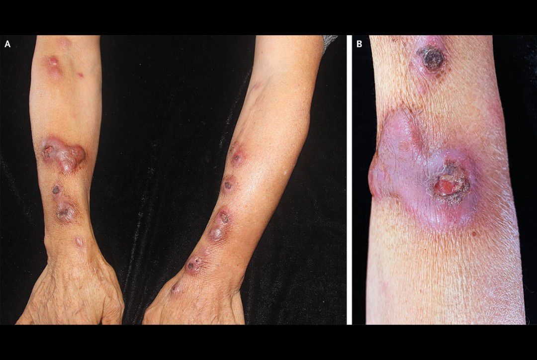 A 63-year-old woman presented to an outpatient clinic with an 8-week history of nodules on her arms. She recalled cutting her thumbs while cleaning fish that she had purchased at a seafood market in preparation for a meal, and the lesions began to develop 6 weeks later. She had no fevers. Four weeks before presentation, she had been evaluated at another clinic, where she received treatment with itraconazole for suspected infection with Sporothrix schenckii; no improvement was seen. Physical examination at the current clinic revealed painful pink nodules and ulcerations with a hemorrhagic crust on both arms (Panel A; Panel B is a close-up of the right forearm). A biopsy specimen was obtained and revealed multiple granulomas. Cultures grew Mycobacterium marinum, a nontuberculous mycobacterium that is found in aquatic environments. Infections typically result from exposure to contaminated water when there are breaks in the skin. Itraconazole was stopped, and the patient received treatment with moxifloxacin, rifampin, and clarithromycin for 6 months. She had complete resolution of the infection. At a follow-up visit 1 year later, the nodules had resolved but scarring remained.