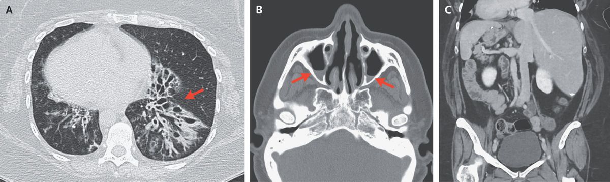 A 46-year-old woman with Kartagener’s syndrome presented to the primary care clinic with a 2-week history of fevers, worsening productive cough, and shortness of breath. In the clinic, she was afebrile and had an oxygen saturation of 95% while breathing ambient air. The examination was notable for rales and expiratory wheezing in both lungs. Computed tomography (CT) of the chest showed bronchiectasis in both lower lobes, with tree-in-bud nodularity. Bronchiectasis was most prominent in the lower left lobe (Panel A, arrow). Known dextrocardia was also noted. Sputum cultures grew Pseudomonas aeruginosa; treatment with levofloxacin was initiated, and the cough, shortness of breath, and fevers resolved. Two months later, facial pain developed, and CT of the head showed findings consistent with acute sinusitis with maxillary sinus air–fluid levels (Panel B, arrows), as well as chronic mucosal thickening. The patient’s symptoms again abated after antibiotic treatment. A previous abdominopelvic CT had shown situs inversus totalis (Panel C). Kartagener’s syndrome, a subtype of primary ciliary dyskinesia, is characterized by the triad of situs inversus, chronic sinusitis, and bronchiectasis. The syndrome is also associated with infertility. This patient continues to follow up with a multidisciplinary team.