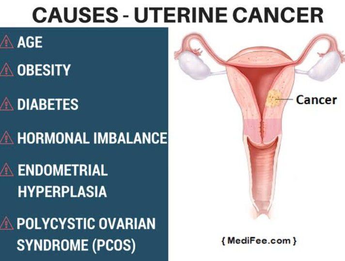 Causes of uterine cancer being postmenopausal, or reaching menopause (after age 55) a thickened wall lining (endometrial hyperplasia) never having children. starting periods early (before age 12)