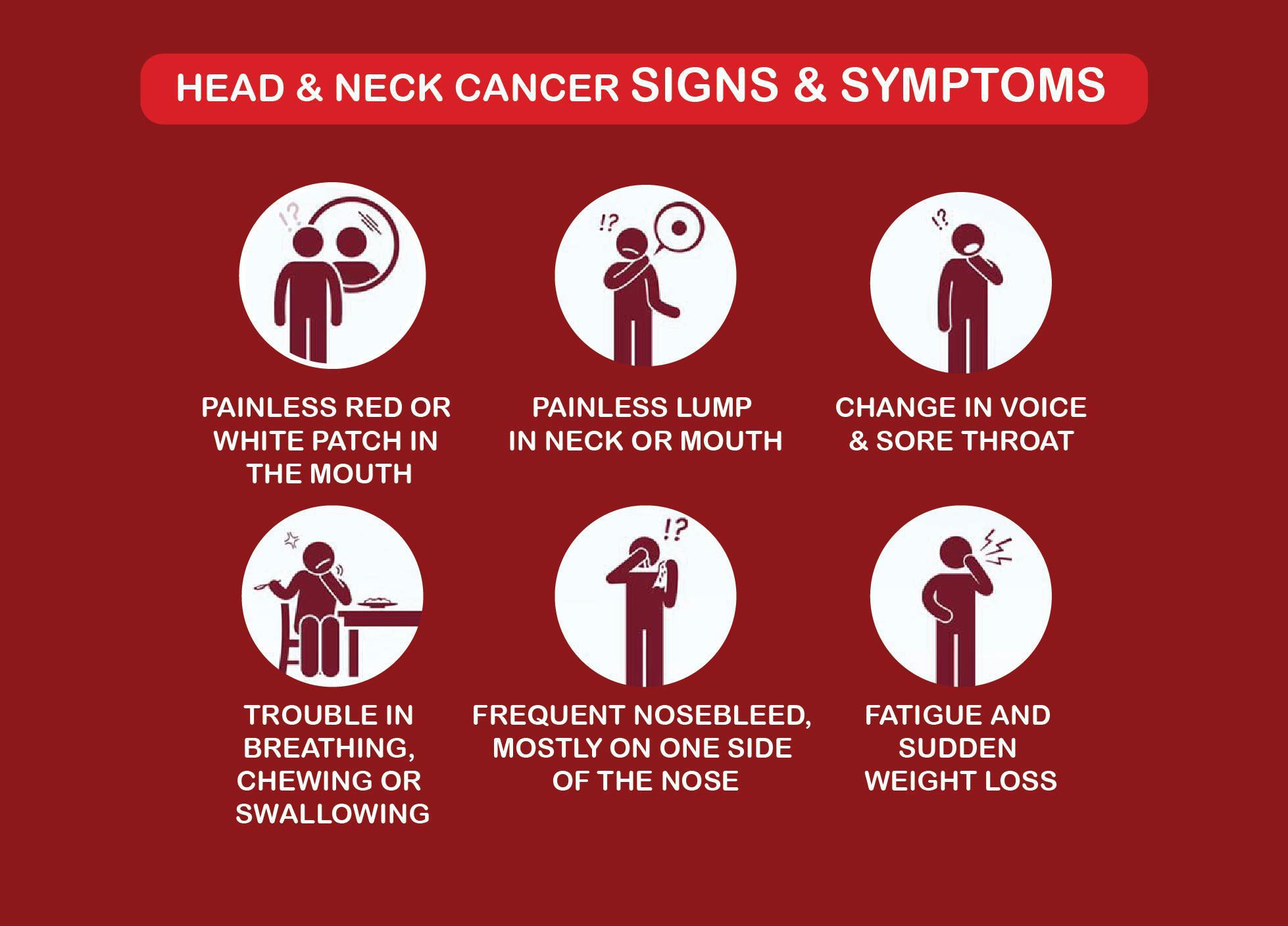 Some general signs of head and neck cancer include the following: A Lump on the back of Neck, Jaw, or Mouth. A Mouth Ulcer. Pain or Weakness in the Face. Neck Pain. Difficulty Moving the Jaw. Difficulty Swallowing. Speech Problems. Ear Pain or Hearing Loss